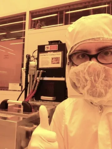 After that, the newly-minted Dr. Nolta was eager to start designing better neural microelectrodes, but realized he had limited hands-on experience with the complicated techniques required to fabricate microelectrodes. Dr. Martin Han, a recent arrival at the University of Connecticut, had previously developed his own microelectrodes with a very different architecture than the Utah Array. He hired Nick as a postdoc to re-establish his microfabrication process at his new location. In the photo, Nick is wearing a "bunny suit" in a yellow-lit cleanroom, where dust and blue wavelengths of light must be kept to a minimum. Similar techniques and facilities are used for the production of computer chips. Together Dr. Nolta and Dr. Han developed improvements to the material robustness of the microelectrodes and tested them using high-temperature saline soak tests, with the eventual goal of obtaining regulatory approval for human clinical trials. Dr. Nolta also found time to contribute to Dr. Han's other projects involving spinal cord stimulation and image reconstruction.